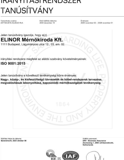 Az ELINOR Mémökiroda Kft. tevékenységét minőségirányítási rendszer (ISO 9001: 2015 és ISO 14001:2015, DNV) támogatja, ezen kívül rendelkezik szakmai felelősségbiztosítással (Allianz Hungária Biztosító) is.