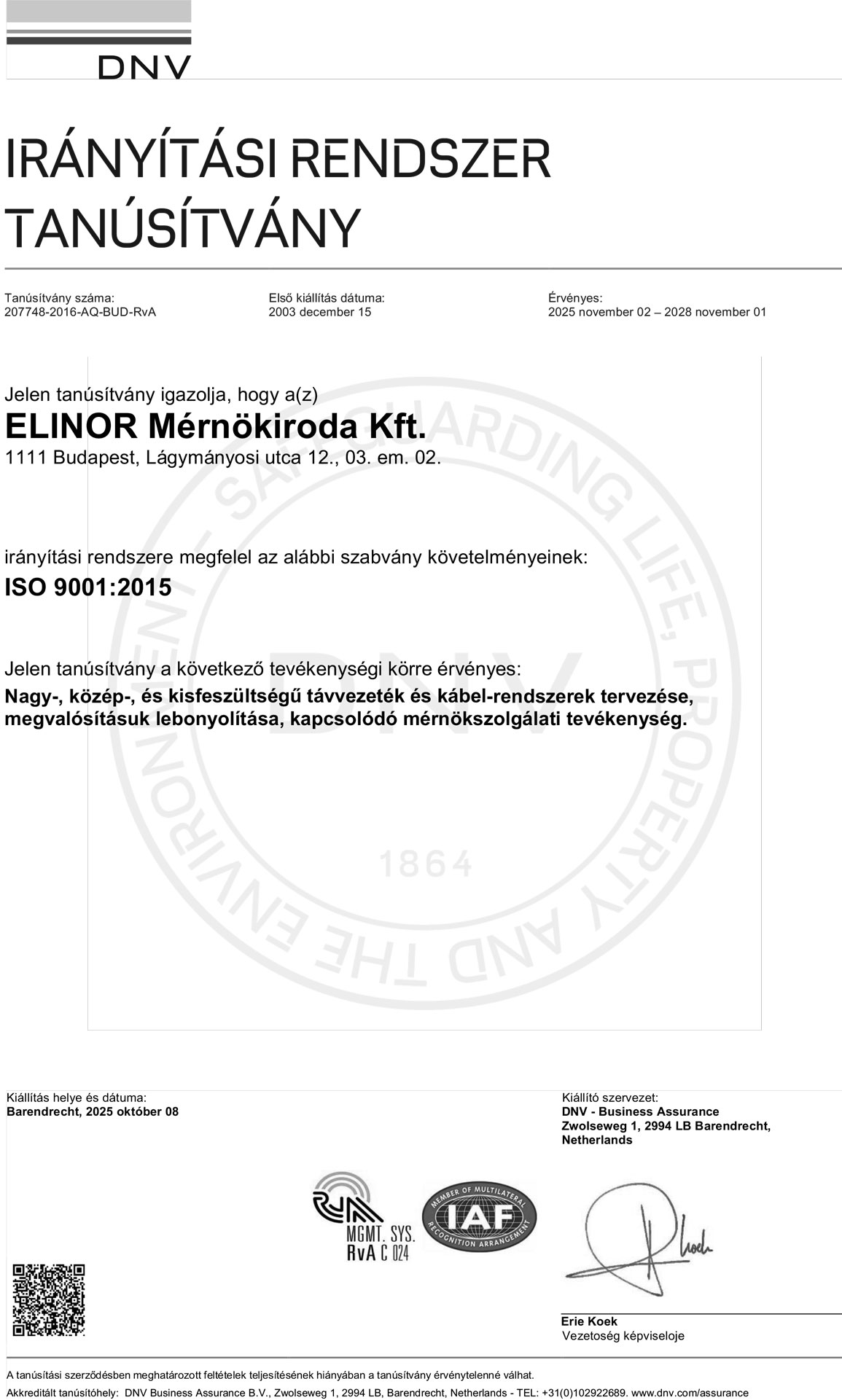 Az ELINOR Mémökiroda Kft. tevékenységét minőségirányítási rendszer (ISO 9001: 2015 és ISO 14001:2015, DNV) támogatja, ezen kívül rendelkezik szakmai felelősségbiztosítással (Allianz Hungária Biztosító) is.